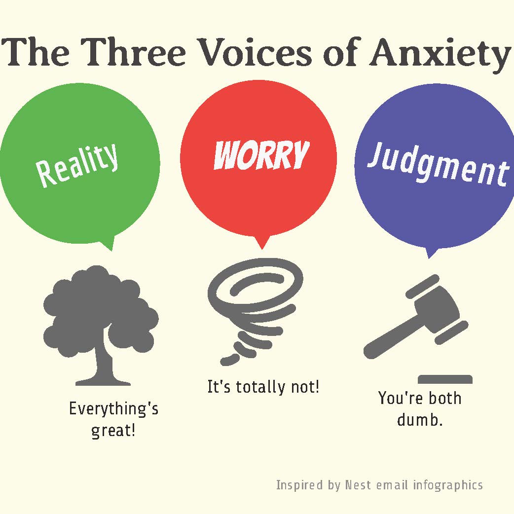 My biggest breakthrough with the three contrasting voices above came when I finally allowed them to all say what they needed to say. I saw them as a natural presence, like allergies in pollen season or a stomach ache after eating too much. If I have a physical ailment, I rest and respect that I need time to regain my health. Now when I hear these anxieties creeping up, I try to give each their own space and then ask what they all need from me to feel better. Quite often, Reality needs to be recognized, Worry needs to be comforted, and Judgment needs to be supported with tales on self-worth and confidence. When you feed your demons, you are letting them rest.