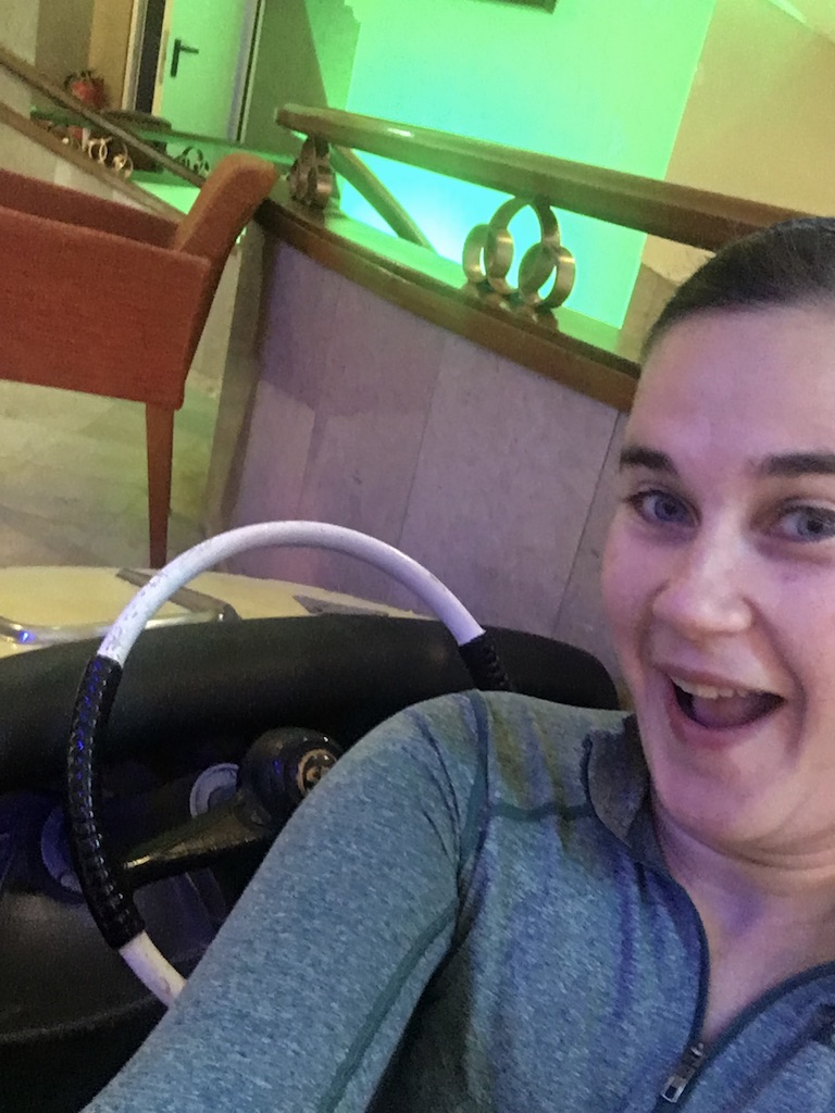 The hotel outside my room looks much less Twilight Zone-y after a bit of sleep. I hop into one of the bump ’em cars and take a selfie for Ben. I appear to be the only person on my floor at the moment so I get to be a weirdo tourist. The elevator looks horrifying–another form of transportation I’m not fond of–so I follow the winding steps downward, lit in green and red, into the lobby.