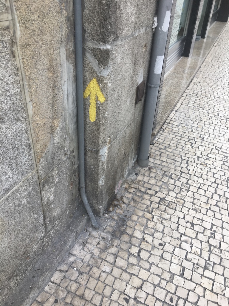 I turn the corner, and voila! There it is! The first arrow! It is painted next to a storm drain and is pointed in the direction of the main shopping street, undoubtably north. Walking the Camino through a city is notoriously difficult since you’re not following a hiking trail, but instead, are typically winding through a pre-determined route that takes you past the church. This is not often a straight shot, and it’s easy to get lost.