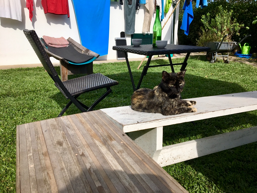 The backyard was filled with sun for drying your clothing and kittens soaking up the afternoon heat. After claiming a corner bed, I visited Sophie, who had been given the bed on the uncovered back porch, surrounded by a mosquito net. She was thrilled for the chance to have an adventure outside–and to sleep a night in silence without snores.