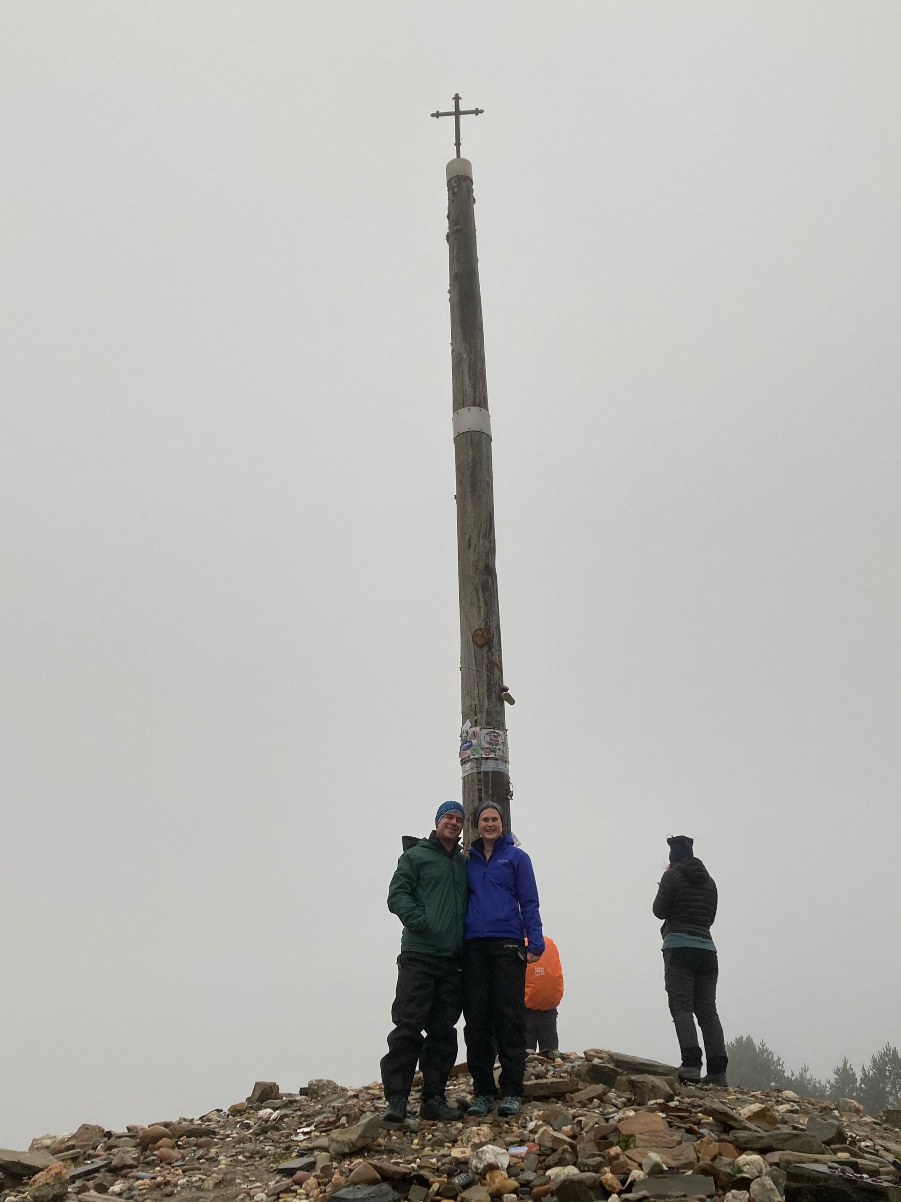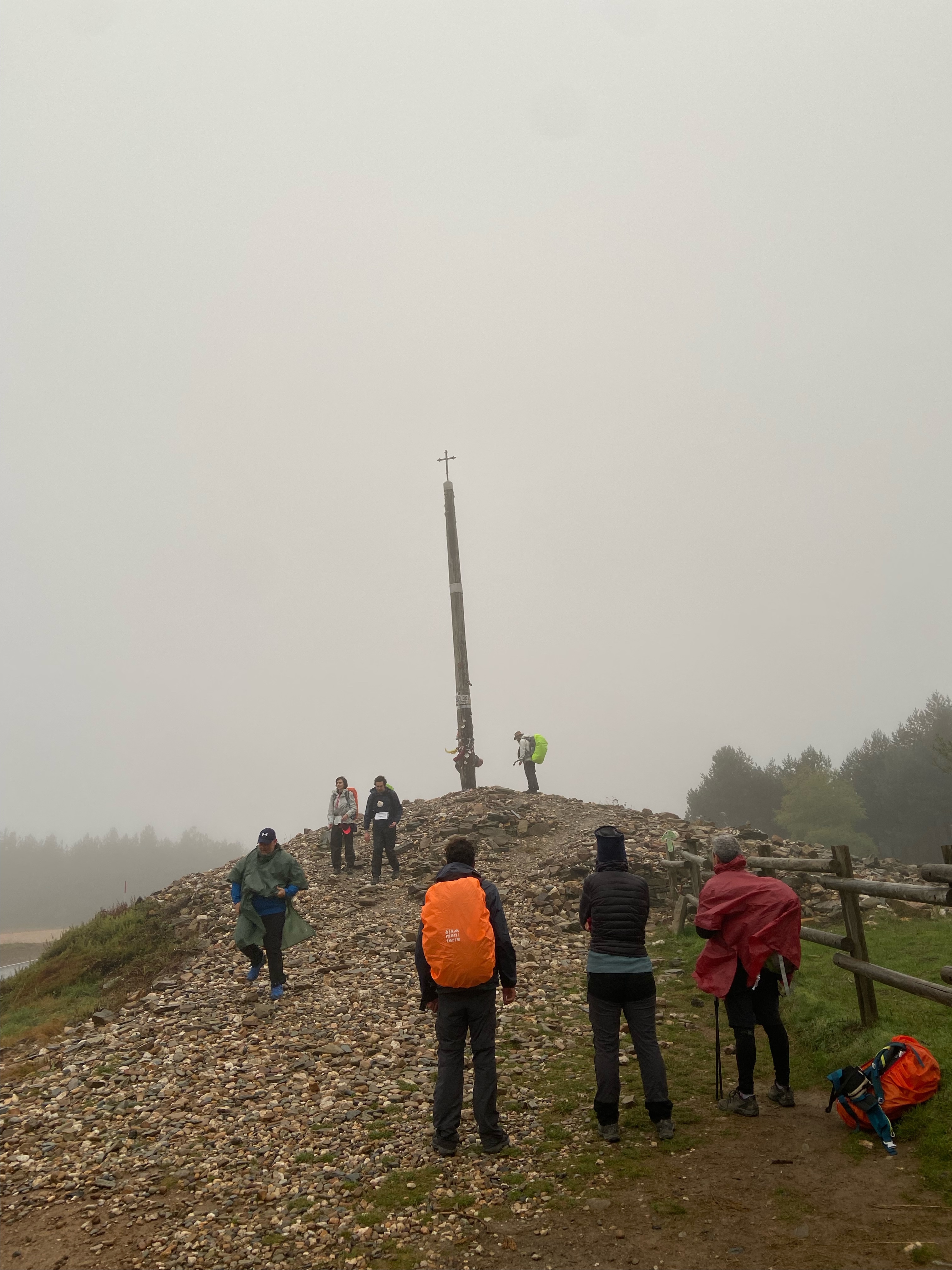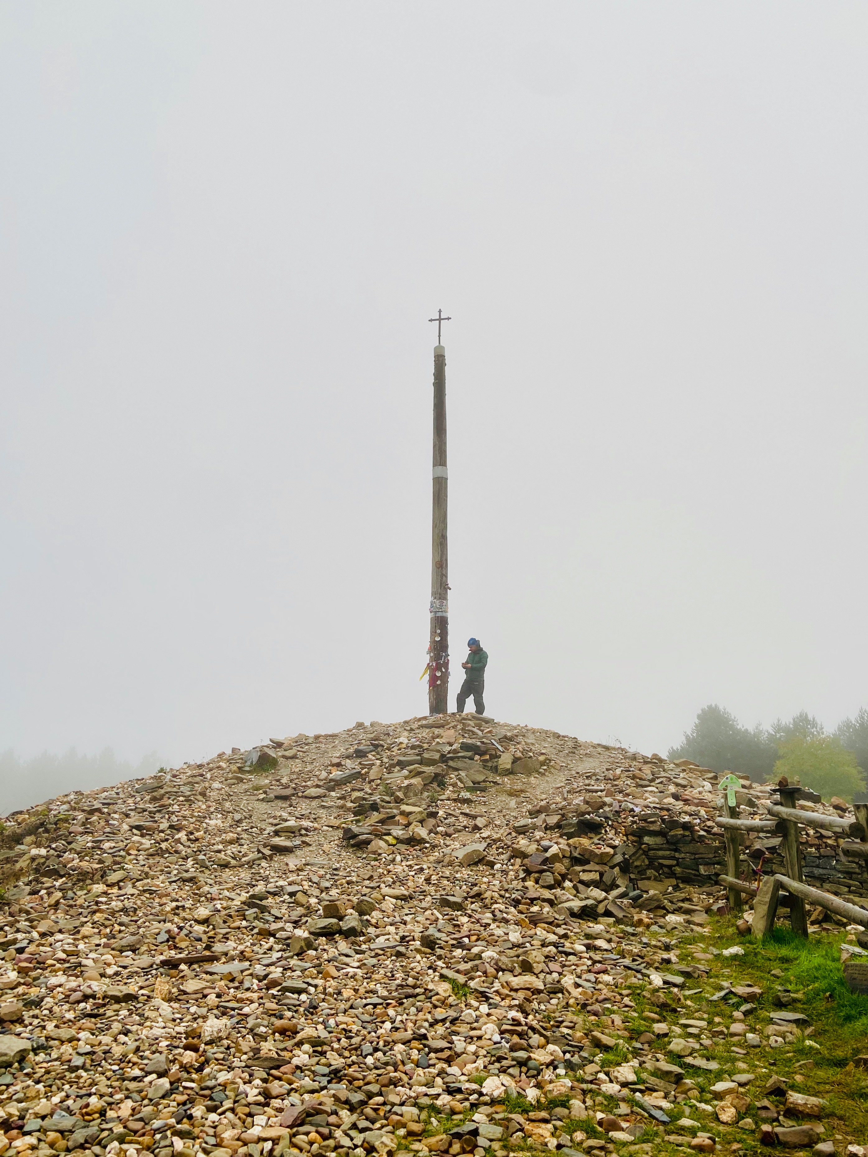 Before I had time to check our progress on the map, I looked up. The Cruz de Ferro. Suspended in a cloud of gray perched on the edge of the mountain. Hikers lined up, letting one or two people climb up at a time.