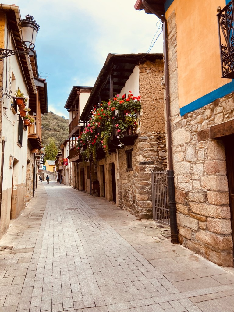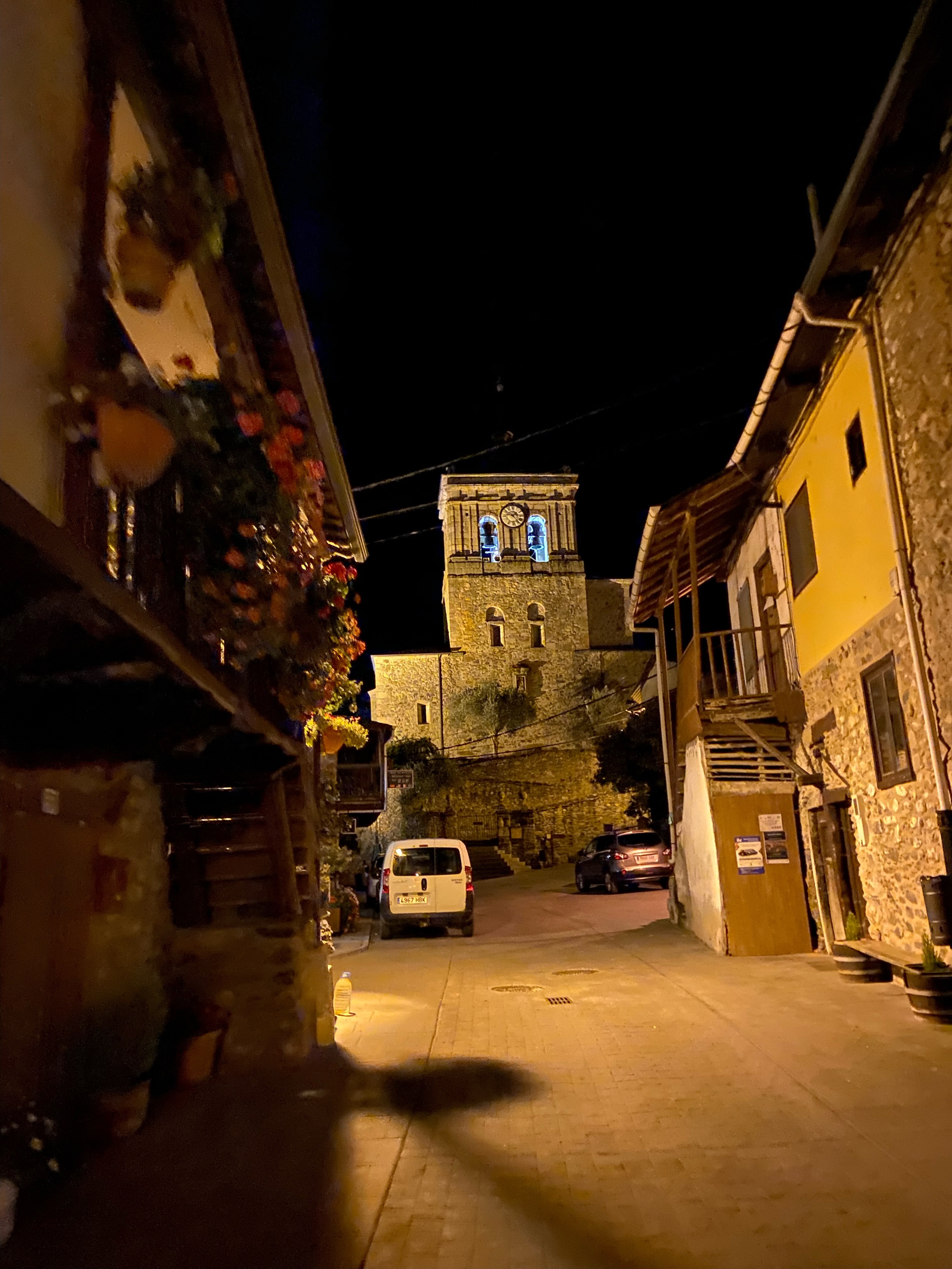 We were still in that witching hour between siesta and dinner, so we knew we couldn’t find food for several more hours (and half regretted tossing the gnat ham sandwich). But we wandered through the village and Ben marveled at how beautiful and unique the buildings were. Thank goodness for his enthusiasm. The town looked very different to me. Hardly anyone on the streets, businesses closed, yellowed signs on windows from 2020 warning pilgrims to return home. Ben’s joy buoyed me.