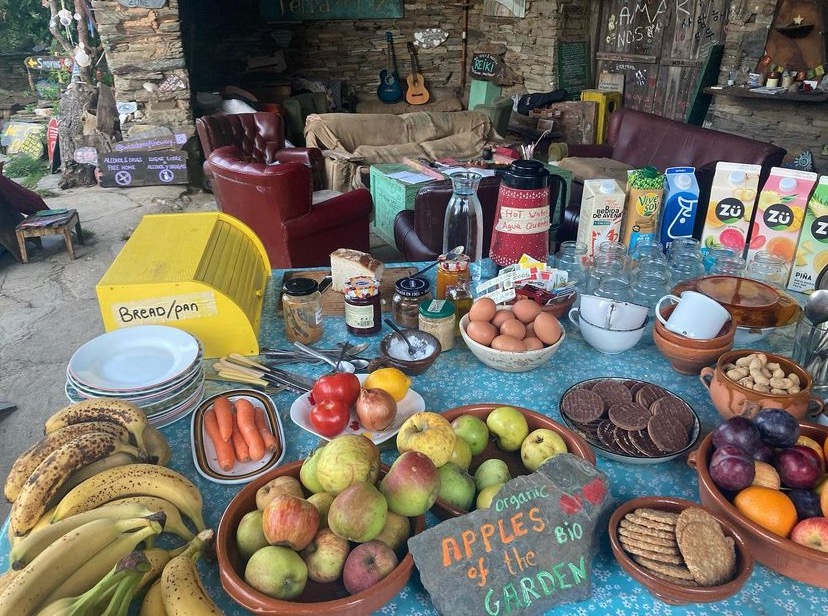 And then I reached the large barn at the end of the road. Even three feet away from the barn door entrance, you wouldn’t suspect anything different about this place. But in the final split seconds–I saw it: a massive buffet of bread, cheese, fruits, trail mix, coffee, tea. Everything you could imagine. The area behind the table opened up into a massive oasis of flowers, couches, chairs, and a place to sign and leave your Camino shell–something that everyone carries on the walk–if you felt it was time to leave it behind.