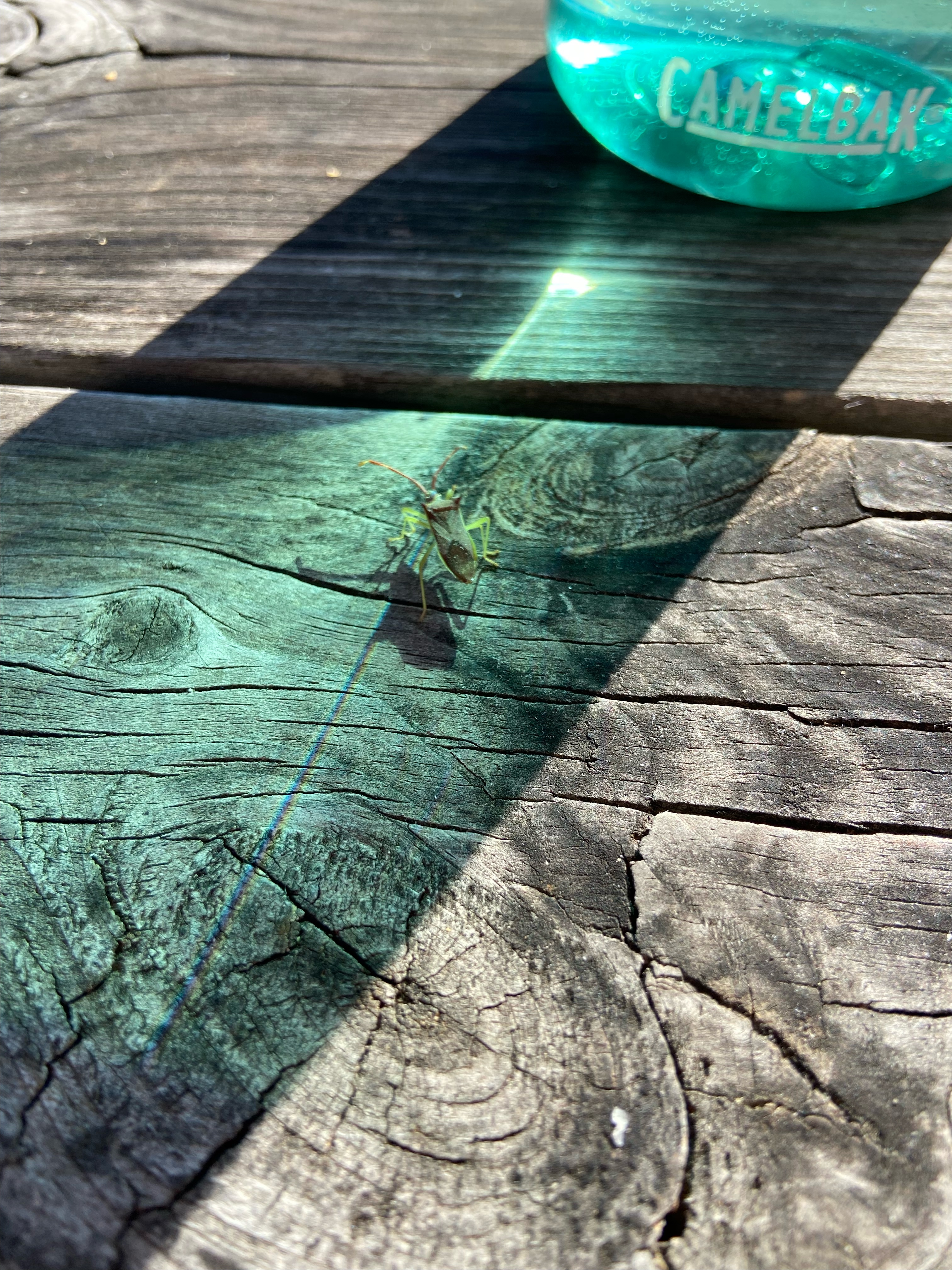The sun filtered through my–now clean–water bottle, casting a green hue on the table across an incredibly fascinating bug. I leaned my head down on the table so I could be at its eye level. “Hello creature,” I greeted it.